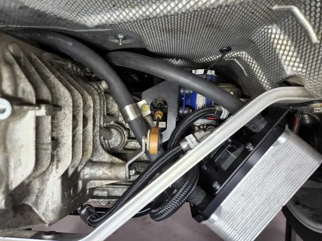 Porsche Cayman and Boxster 987.2 PDK models do not come equipped with a gear cooler for the PDK transmission from the factory. The gear fluid in your PDK transmission has the tough job of keeping everything inside the gearbox properly lubricated and can often overheat when tracked, especially if fitted with a limited slip differential. Gear oil that is overheated can break down and provide inadequate protection, leading to premature wear to expensive components inside your transmission, requiring rebuild or replacement of your gearbox. Starting with 981 and 991 models, Porsche added an oil to water heat exchanger to cool the gear fluid. We’ve improved upon that design by fitting a substantially larger cooler that will keep your gearbox cool and extend its life significantly.