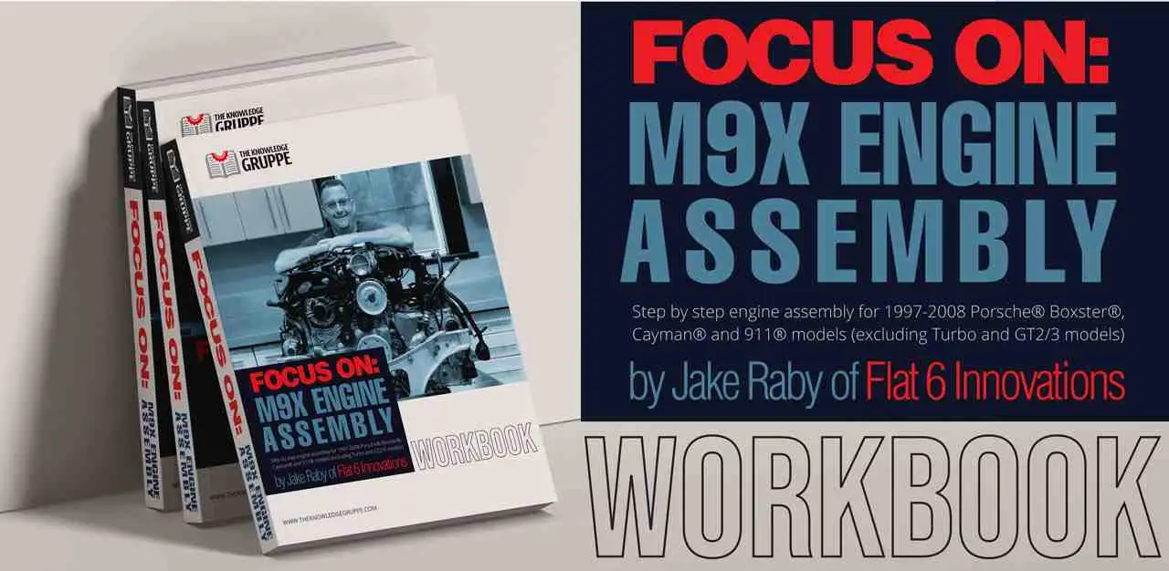 Fresh off the press! Jake Raby’s Porsche M9X Engine Assembly Workbooks available now. This book is designed to work in conjunction with the M9X Engine Assembly video series. This workbook coincides with, and serves as an illustrated transcript of the video series Focus On: M9X Engine Assembly by The Knowledge Gruppe. This supplemental workbook will guide professionals or enthusiasts to assemble an M9X engine, helping merge the step- by- step video assembly procedures with text descriptions and pertinent photos. Due to this workbook being a transcript of the video series, it should not be used as a sole resource material, and is therefore not available as an individual purchase. Flat 6 Innovations, a division of Raby Enterprises Inc. was founded in the early 2000s to support the development and specialized repair for the Porsche M96/M97 family of engines fitted to Porsche Boxster, Cayman and 996/997 series vehicles. Flat 6 Innovations, in partnership with LN Engineering, developed the first engine program to effectively reconstruct and enhance the M97/M97 engine.