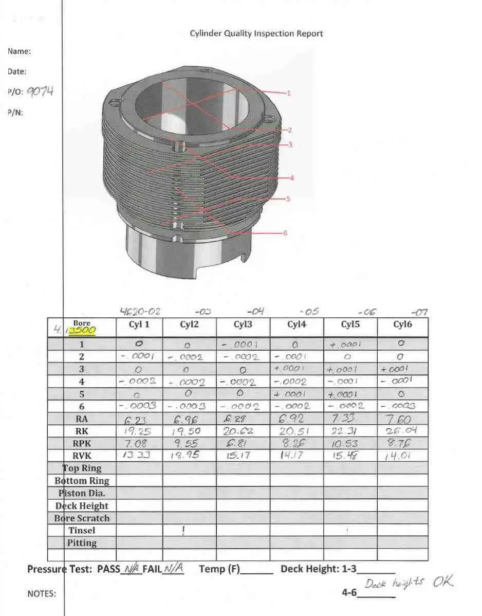 2. The factory 3.3 turbo half-finned cylinders should not be re-plated or reused in our opinion. The same goes for any cylinder that is severely ovaled or distorted from overheating or damaged from detonation or over-boost. Tell tale signs of this damage can be found by performing a visual inspection of the sealing surface, rings, and pistons for detonation. Rockwell testing can also be used to test if any one cylinder is significantly softer than the others, it is suspect to be bad and should be replaced.