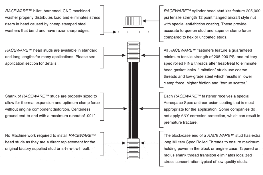 RACEWAREโ„ข cylinder head stud kits are able to prevent head leaks that other highly marketed brands of engine fasteners cannot. This has been proven over and over by engine builders and auto enthusiasts who purchased other brands of head stud kits only to experience chronic cylinder head and cylinder head gasket leaks. They ended up replacing those highly advertised aftermarket head stud kits with a genuine RACEWAREโ„ข head stud kit to permanently eliminate head gasket leaks in their engines. The other fastener brands may look similar to RACEWAREโ„ข but history and independent lab testing has shown that that the other brands donโ€™t perform the same as RACEWAREโ„ข Aerospace Quality engine fasteners because they lack the superior engineering designed into every RACEWAREโ„ข fastener. Results are what counts, not advertising claims and RACEWAREโ„ข 205,000 PSI tensile strength Aerospace Quality engine fasteners have proven to be the best fasteners for the German engines, bar none, and our customers have proven this countless times!