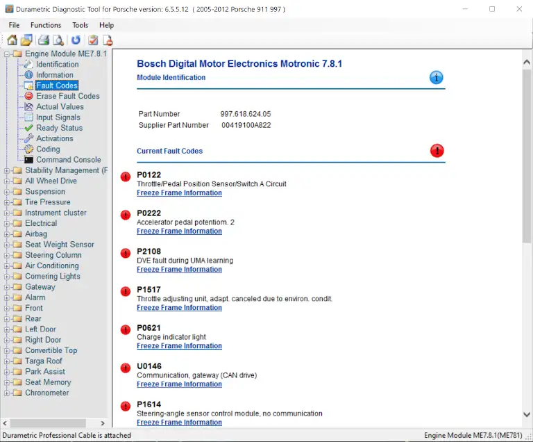 The Durametric Diagnostic software can display and clear error messages from most Porsche control systems. Many Porsches manufactured after 1990 are equipped with multiple onboard computers that can self-diagnose issues. Essentially, when the car identifies a problem, a warning light shows up on the dashboard to alert the driver.Traditionally, understanding the root of the issue often meant turning to a Porsche dealership to interpret the diagnostic information and provide potential solutions. However, with the Durametric tool, users can directly access and understand error messages to better gauge their Porscheโs service requirements.The Durametric application provides a view into the fault codes of a Porsche 911 engine, for example. For each error detected by the vehicle’s computer, the software presents both the code and its meaning. Notably, there’s a feature to “Erase Fault Codes” and other options, enabling users to reset the warning light.