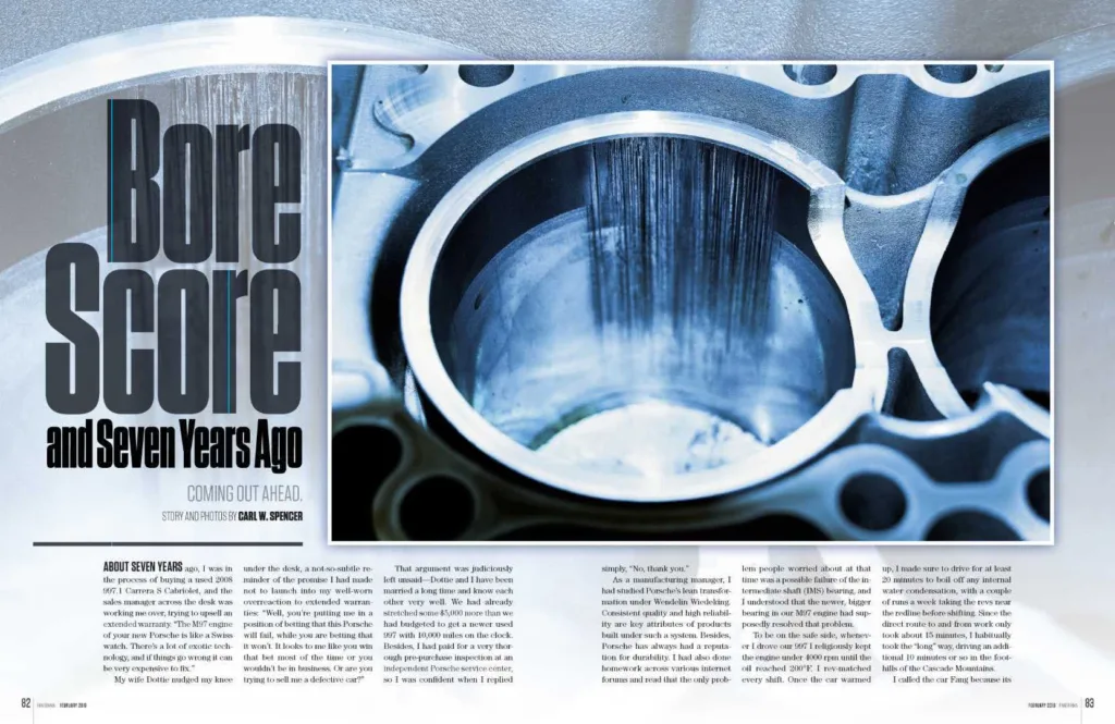 For those of you who are Porsche Club of America members, PCA published an excellent article written by Carl Spencer, Bore Score and Seven Years Ago, in the February 2019 issue of Panorama. This is a great read for anyone concerned about or experiencing cylinder bore scoring and how to deal with the problem, where Carl Spencer explains the steps he took when his 997 suffered this expensive failure.