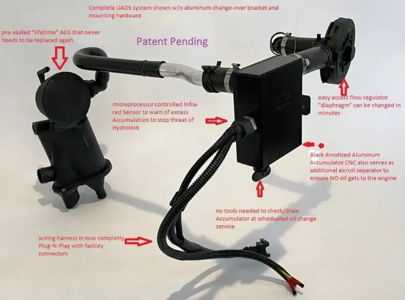 The patented Ultimate AOS (USPTO Patent # 11,326,489) design works by taking a systematic approach to the problems associated with the factory Porsche AOS by correcting and improving them. The factory M96/M97 AOS design used in 1997 through 2008 Porsche Boxster, Cayman, and 911 models is well known for failing of the flow control diaphragm, resulting in increased oil consumption, excess smoking, and in severe cases, engine hydrolock leading to bent rods and cylinder damage. When the flow control diaphragm fails in the factory Porsche AOS, the present procedure is to replace the complete AOS. This procedure is very labor intensive due to the location of the original AOS and involves hours of labor.