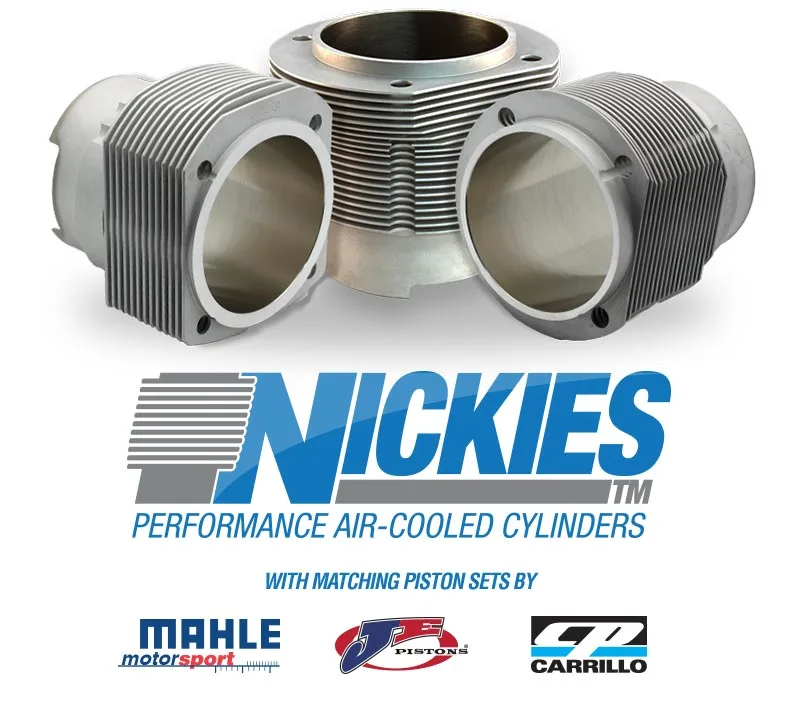 Looking for replacement Nikasil cylinders for your aircooled Porsche? We’ve got you covered with our complete line of Nickies billet aluminum NSC plated cylinders for Aircooled Porsche 356, 912, 911, 914, 912E, as well as for VW Type 1/4 engines. Complete piston and cylinder sets are available featuring JE Pistons, CP Pistons, or Mahle Motorsport Pistons with stock bore size and big bore oversized Nickies cylinders.