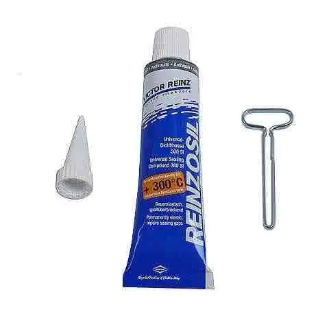 Properties: This highly elastic universal sealing compound (silicon sealant) is resistant to mineral oils and numerous synthetic oils, lubricants, petrol, diesel oil, greases, hot and cold water, detergents, sunlight, ozone, and sea water. REINZOSIL is suitable for continuous operation in the temperature range between -50 °C and +250 °C (briefly up to 300 °C). Hardness (softness) lies in the range of 30 to 35 Shore A. Application Due to its special properties, REINZOSIL is used in the most varied applications, e.g. as FIPG (formed-in-place gasket) for wet assembly, i.e. for sealing small gaps under pressure as well as for cylinder liners in piston machines, and also to compensate for extensive component warping. Moreover, the compound is also used to seal constructional fissures or cracks, and for seals that are subjected to considerable relative movement. The compound can also be applied to assembled components. In these cases, after the sealing joint has been cleaned and degreased, REINZOSIL is applied directly to the sealing gap, similar to the procedures used in the building industry.